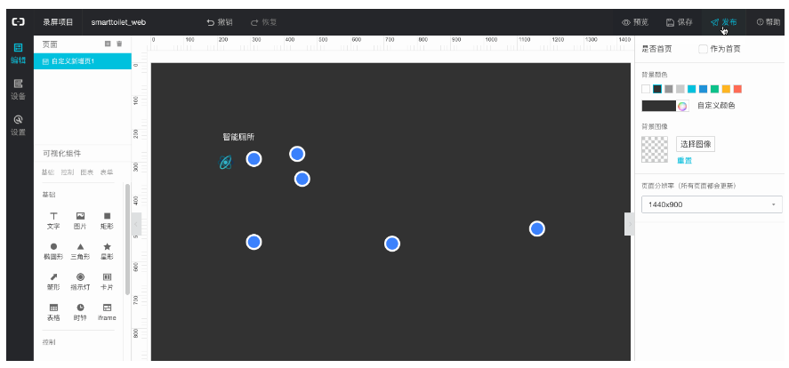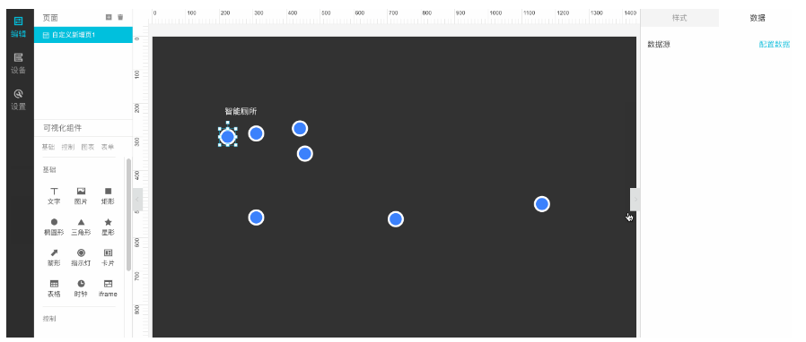 进入编辑中,可以改变背景色,添加标题文字等。对最重要的厕所占位状态,可以理解为一个“有人”、“没人”的指示灯,因此把指示灯组件放入画布中。并配置数据源。