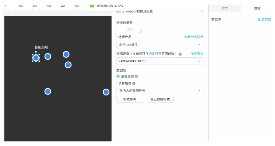 配置数据源时,选择产品,关联的设备,以及关联的布尔型属性。点击“验证数据格式”获得通过,之后点击确定完成配置。配置之后可以通过上传图片等修改指示灯开关状态的样式。