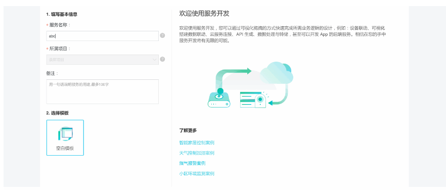 首先新建一个服务——从项目概览页点击“推荐”下的“服务开发”,点击“新建服务”即进入服务开发工作台的新建页面。选择空白模板进行新建。