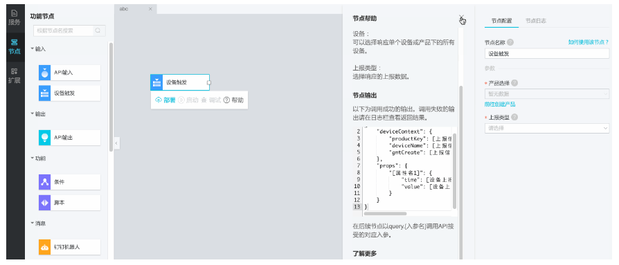 我们首先把厕所的占用时间推送到钉钉机器人上。首先配置一个“设备触发”节点作为输入,选择之前创建的产品,然后选择“所有设备”以监听所有设备上报的信息。最后选择监听“属性上报”。之后配置一个钉钉机器人节点作为消息推送节点。