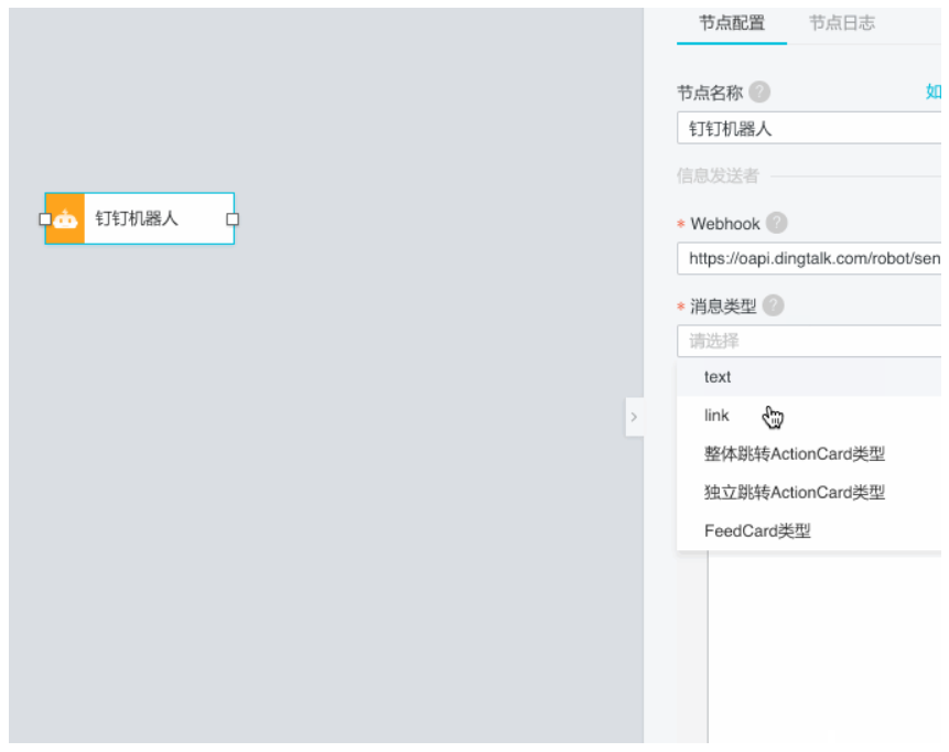 配置webhook以后可以配置推送的信息。钉钉机器人节点目前支持多种消息推送类型,并且支持动态调用设备数据,具体原理可以参考这篇文档。以后也会陆续推出教程教学如何玩转钉钉机器人节点。
