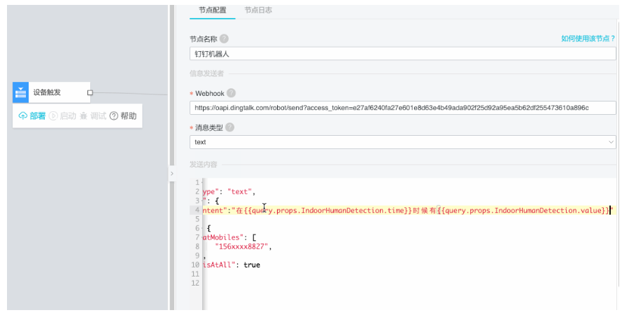{"msgtype": "text", "text": {"content":"在{{query.props.IndoorHumanDetectionSwitch.time}}时候有{{query.props.IndoorHumanDetectionSwitch.value}}人进坑!"}, "at": {"isAtAll": true}