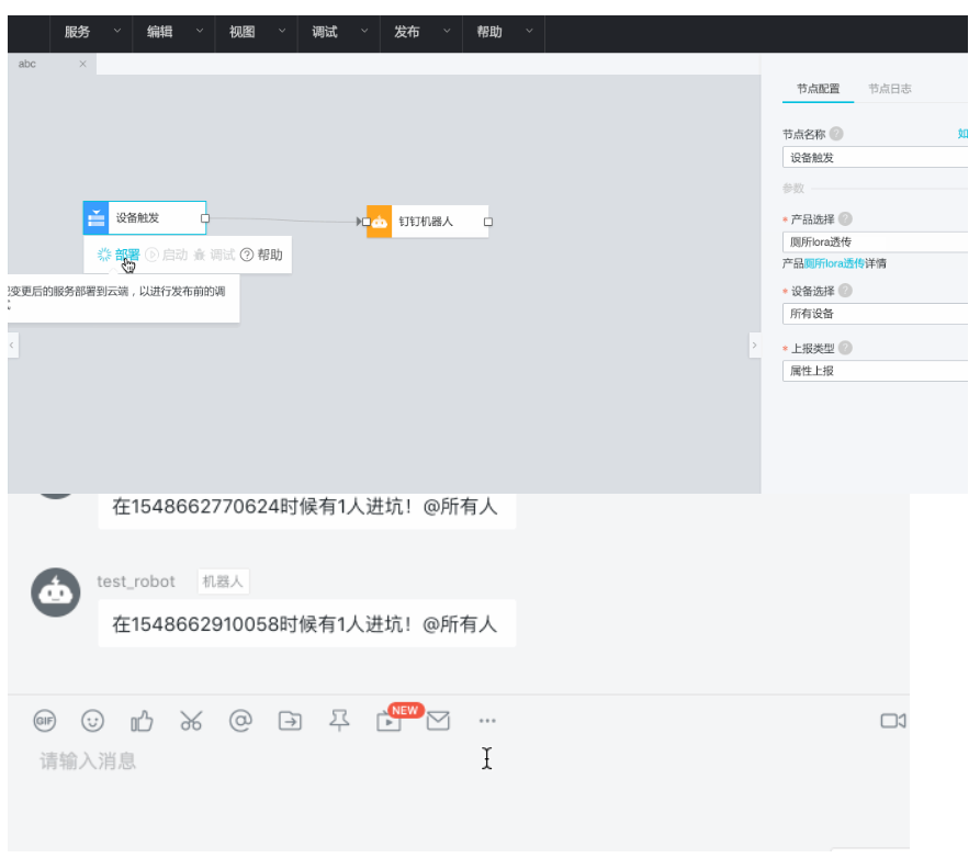 }配置完成之后,可以点击“部署”对服务进行部署。之后点击“启动”让服务生效。如果设备已经上线,则可以直接看到机器人的消息推送。如图所示。这样就能实现厕所使用状态的实时推送了。