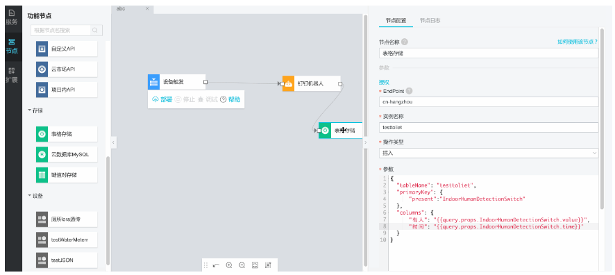 如果需要把厕所的使用状况使用TableStore,云数据库MySQL等云产品存储起来,可以使用存储节点。