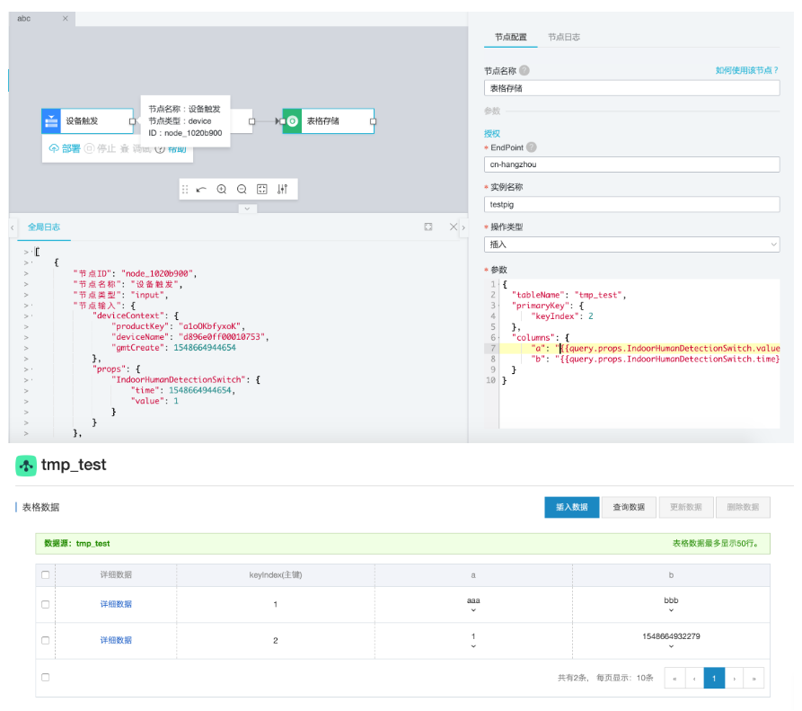 服务开发(原服务编排)可以通过可视化拖拽的方式快速完成所需业务逻辑的设计,例如:设备联动、可视化搭建数据联动、云服务连接、API 生成、数据处理与转储,生成 App 的后端服务。在本文中,我们要使用服务开发完成智能厕所坑位状态的推送,以及把厕所使用状况转储到表格存储Table Store上。