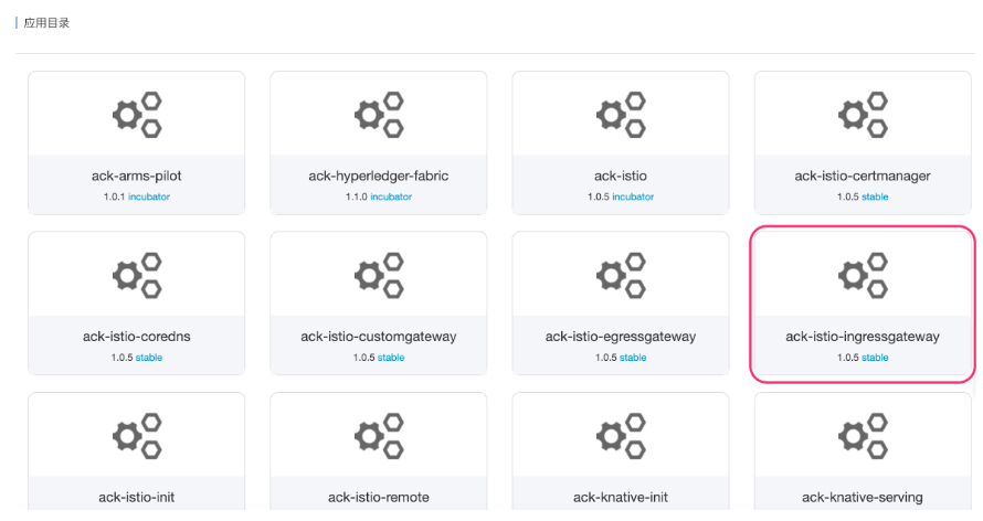 登录容器服务管理控制台,点击左侧的应用目录,在右侧选中ack-istio-ingressgateway,如下: