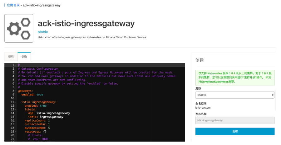 点击参数, 可以通过修改参数配置进行定制化,默认参数提供了使用Istio IngressGateway的配置项,然后点击创建按钮。