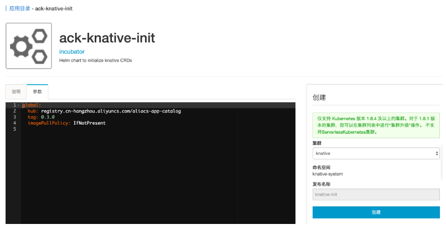 登录容器服务管理控制台,点击左侧的应用目录,在右侧选中ack-knative-init,如下: