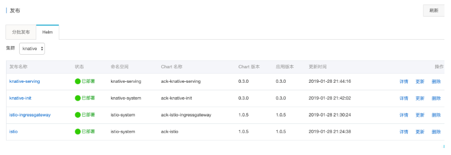 至此,安装Knative Serving所需的4个Helm chart都已经安装完毕,如下所示: