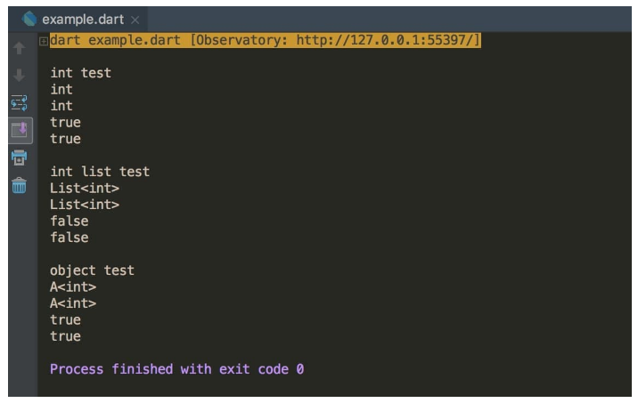 void main() {print('int test');test<int>(1);print('\r\nint list test');test<List<int>>(<int>[]);print('\r\nobject test');test<A<int>>(A<int>());