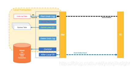 如果决议是全局回滚,RM 收到协调器发来的回滚请求,通过 XID 和 Branch ID 找到相应的回滚日志记录,通过回滚记录生成反向的更新 SQL 并执行,以完成分支的回滚。
