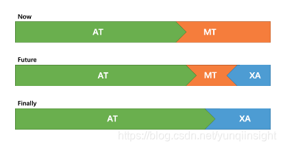 回到我们设计的初衷:一个理想的分布式事务解决方案是不应该侵入业务的。MT 模式是在 AT 模式暂时不能完全覆盖所有场景的情况下,一个比较自然的补充方案。我们希望通过 AT 模式的不断演进增强,逐步扩大所支持的场景,MT 模式逐步收敛。未来,我们会纳入对 XA 的原生支持,用 XA 这种无侵入的方式来覆盖 AT 模式无法触达的场景。