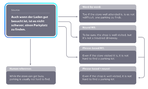 § 对于德语-英语任务,基于神经和短语的翻译模型组合得到BLEU得分为25.2(高出基线10个BLEU点)。