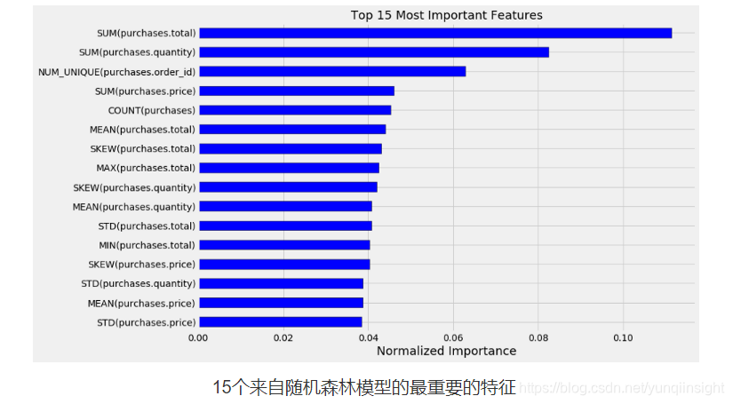 除了提供令人印象深刻的预测能力之外,FeatureTools的实现还为我提供了一些同样有价值的东西:可解释的特征。看一下随机森林模型中的15个最重要的特征:
