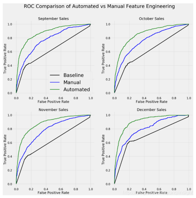 比较自动的和人工的特征工程结果的ROC曲线,左侧和顶部的曲线表示其性能表现更好。