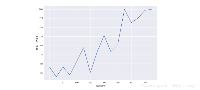 我们现在已经准备好在CartPole-v0上训练我们的单工A2C代理了!训练过程不应超过几分钟,训练完成后,你应该看到代理成功达到200分中的目标。