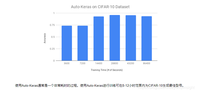在上图中,你可以看到训练时间(x轴)对使用Auto-Keras的总体准确度(y轴)的影响。较短的训练时间,即1小时和2小时,大约可以达到73%的准确性。一旦我们训练4小时,我们就能达到高达93%的准确率。训练8-12小时,我们就能获得95%的精确度了。超过8-12小时的训练不会提高我们的准确度,这意味着我们已达到饱和点并且Auto-Keras无法进一步优化。