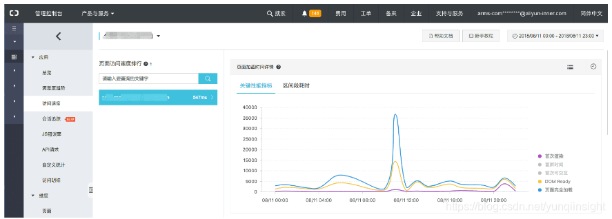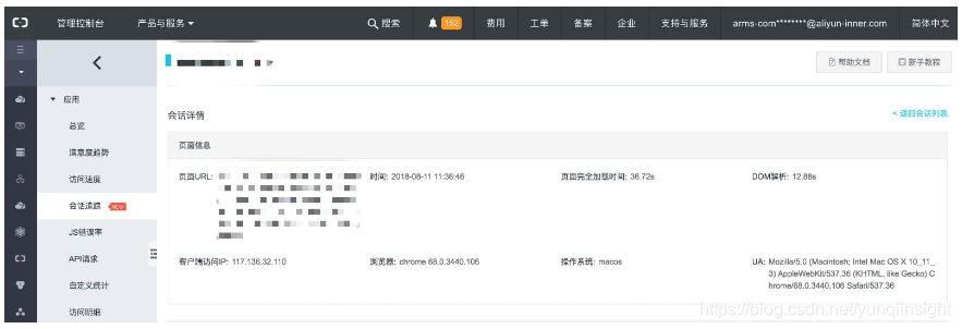 在该模块,你可以快速发现在11点钟有一次会话的页面加载时间在36.72s,这次访问应该是直接导致页面加载时间详情中折线图突然暴增的原因了。