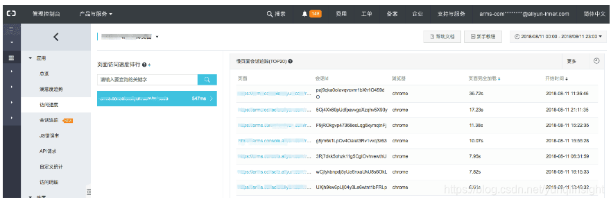 进入访问速度菜单,如果发现页面性能较差,可以在"慢页面会话追踪Top20"中查看访问较慢的会话情况