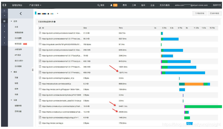 在阿里云ARMS前端监控SDK上将sendResource配置为true,重新部署应用后,在页面onload时会上报当前页面加载的静态资源信息。从而在阿里云前端监控平台即可以对慢页面加载问题快速进行定位。