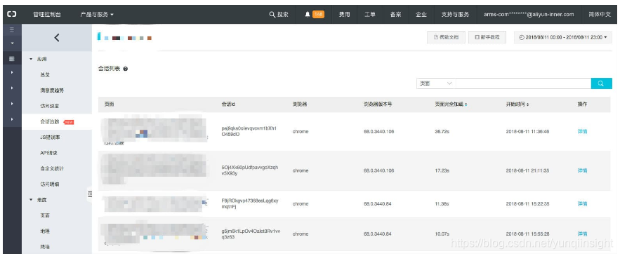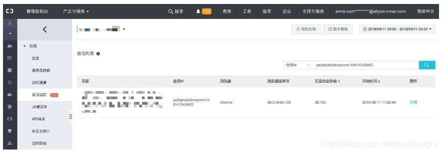 也可以进入“会话追踪”菜单,可以看到该应用下的会话列表。会话列表中会根据页面完全加载时间排序,展示TOP100,帮助用户可以快速发现耗时较长的会话信息。同时支持按照页面、会话Id、浏览器、浏览器版本号进行过滤,展示相关的会话信息。点击操作后,是该会话的页面资源加载详情。