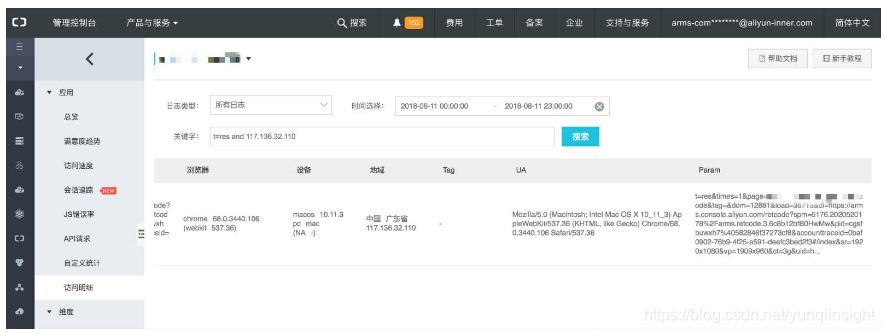 例如:在已知用户的客户端IP的情况下,想定位相应的会话信息,即可以在访问明细中,通过t=res and 117.136.32.110 进行搜索,找到对应的会话Id。