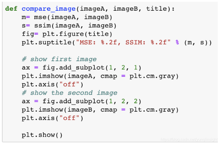 由于SSIM已经通过skimage导入,因此无需进行手动编码。现在创建一个比较函数,该函数的输入为两个图像,分别计算二者的MSE和SSIM,并展示计算结果。