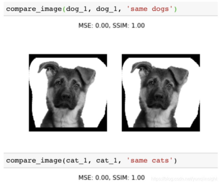 在进行编码之前,这里先对这两种方法予以简单的说明。MSE将计算正在比较的两个图像的每个像素之间的均方误差。而SSIM做的事情与MSE恰好相反,寻找像素值的相似之处。 也就是,如果两个图像中的像素排列相似或具有相似的像素密度值。MSE方法遇到的一个的问题是其结果往往具有任意大的值,因此很难给出标准的评判标准。一般而言,MSE越高,表明两张图像的相似程度越低。如果图像之间的MSE值是随机值,则很难说明二者是否相似。另一方面,SSIM将所有内容归一化到-1~1的范围内(很难得到小于0的分数)。得分为1表示二者非常相似,得分为-1表示二者非常不同。基于此,SSIM相较于MSE而言是一个更好的衡量指标。