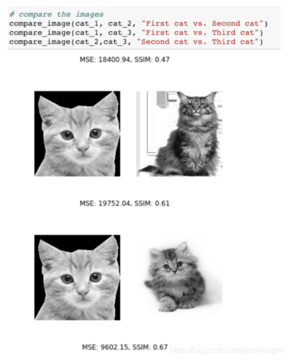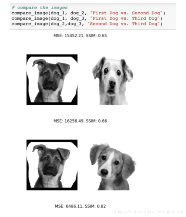 下面看看两种算法的性能比较。正如所看到的那样,MSE的值变化很大,因此该值很难说明其表达的意思是什么。但从SSIM的结果看出,可以看到狗2和狗3相对于其他狗的图像最为相似。从视觉上来讲,我同意这个结果,因为两只狗的耳朵非常像。但我还会认为狗1和狗3会有更高的SSIM值,因为二者的姿势也很相似。实际上,在图像没有进行灰度处理之前,狗2和狗3在鼻子区域周围有类似的白色毛皮,而狗1没有。这很可能是狗2和3具有比狗1更高的SSIM值的原因。对于猫来说,这就有点困难。猫1和猫2具有相似的形状,并且图像是从相似的距离拍摄的,但猫2和猫3具有相似的皮毛颜色。