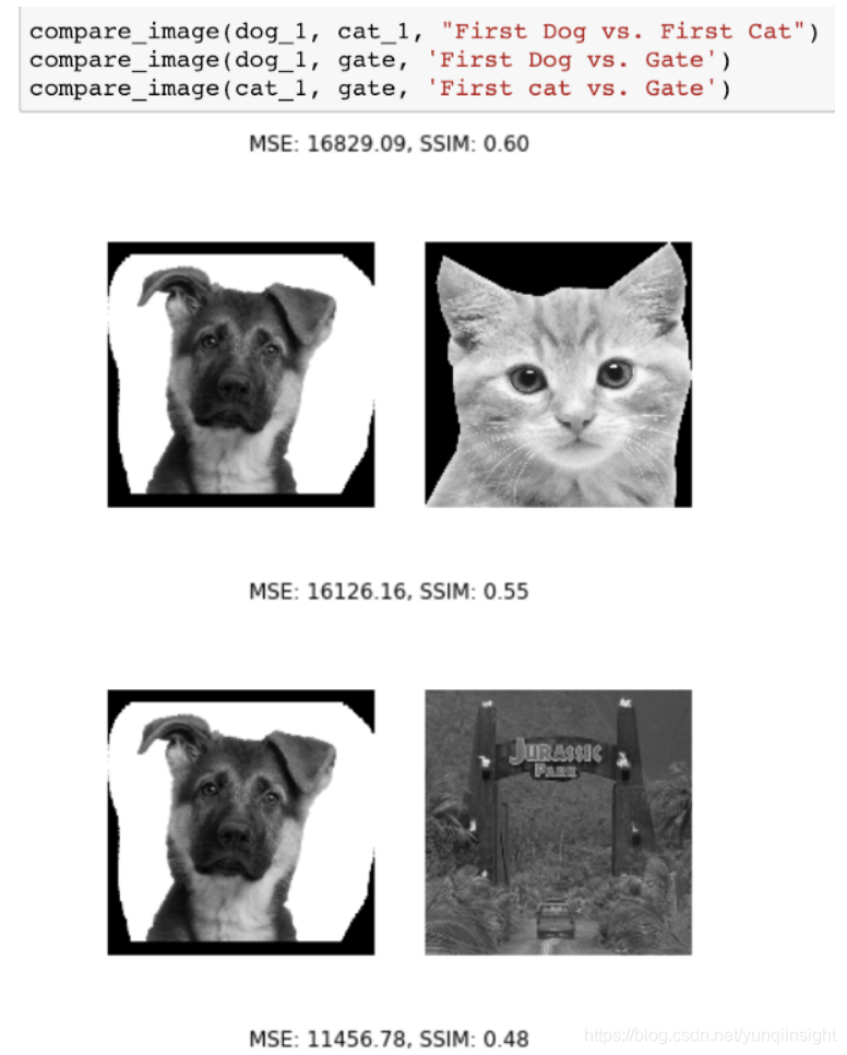 正如所预料的那样,狗和猫是相似的,这点与与无生命的物体相比呈鲜明的对比,如侏罗纪公园入口门。狗和猫对门的图像具有较高的SSIM值,唯一原因在于图像都经过了尺寸缩放和灰度处理。