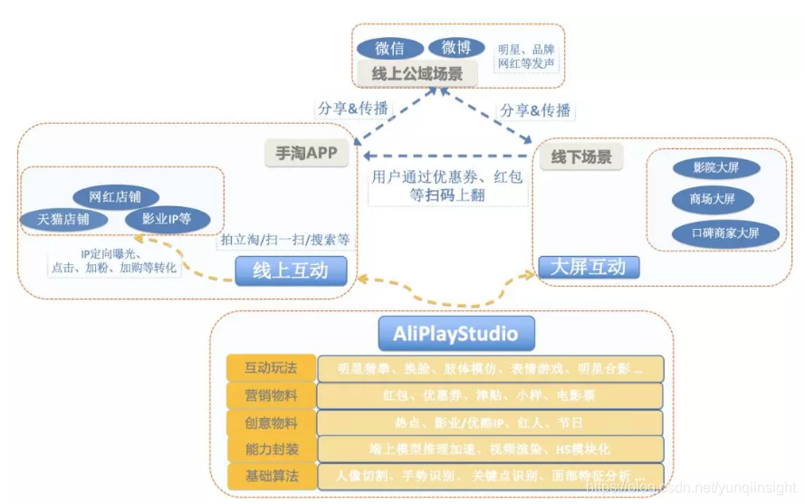 最近一年以来,阿里巴巴搜索事业部和浙江大学宋明黎教授团队联合打造了手淘视频互动平台(AliPlayStudio),分别落地线上互动、线下大屏互动多个场景(线上手淘APP的拍立淘、扫一扫、搜索关键词入口;线下商场大屏、影院互动大屏等)。接入阿里集团内天猫品牌、阿里影业、优酷IP、淘宝网红,行业营销等各类资源,在线上线下让用户互动,打通线上公域场景 、手淘APP 、线下商超这3个流量场。以新颖的视频化互动方式,利用用户对明星、红人、IP、新奇的玩法所产生的好奇心及聚众心理,创造全新的AI互动营销方式,同时结合权益发放、店铺加粉、商品推荐等手段,将互动用户自然转化为真正的消费者。