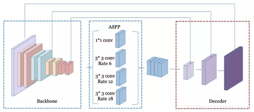 语义分割网络大都采用Encoder-Decoder结构,Encoder负责提取高层语义信息,Decoder负责还原边缘分割细节。对于高精度模型,在backbone选取方面,我们采用了Inception结构。为了获得更大的感受野,我们参考DeepLab系列工作的思路,引入了ASPP(Atrous Spatial Pyramid Pooling)。