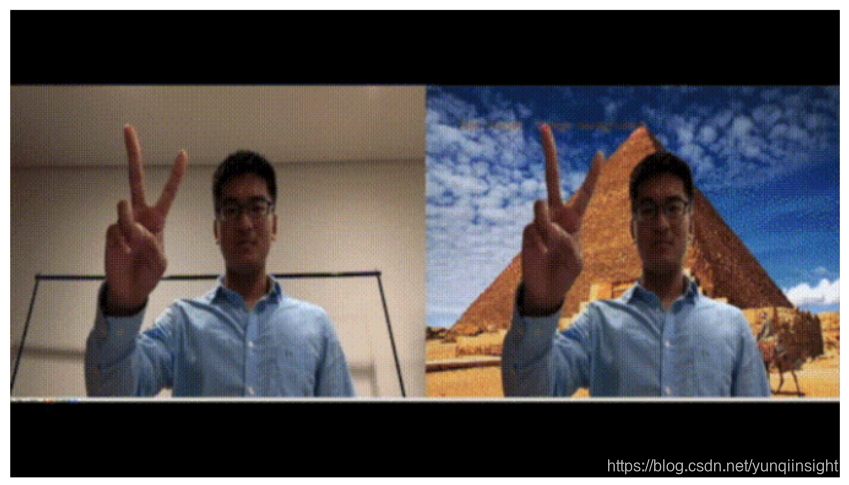 下面是手机端实时切割的效果(同时加上了手势检测,识别剪刀手势来实时换背景):