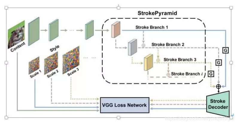 我们设计了一个笔触金字塔结构,通过笔触金字塔(StrokePyramid),把整个网络划分为了很多不同笔触分支,下面的分支通过在前一分支的基础上增加卷积层的方式获得了更大的感受,并利用不同的感受野,使用不同尺度大小的风格图进行训练,之后通过在特征空间进行笔触特征插值(stroke interpolation),来实现任意的连续笔触大小控制。在测试阶段,笔触金字塔通过门函数来控制网络的感受野,从而产生出与感受野对应的不同的笔触大小。