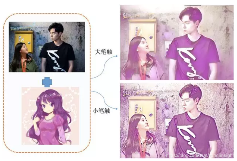 图像风格化算法的目标是在保持内容图的高级语义信息不变的情况下,将风格图的风格迁移到内容图。 风格化算法一般有2类:慢速、快速风格化,我们的互动场景下只适合后者: 对特定风格图训练前向神经网络模型,在测试的时候只需要一次前向即可得到响应结果。虽然快速图像风格化算法的速度较快,但是与此同时带来的一个缺点是风格迁移过程中很多因素变得不可控,比如笔触大小。 给定一个预训练好的网络和一张固定大小的内容图,输出的风格化结果图的笔触大小是固定的,无法让用户进行笔触大小的灵活控制, 即无法实现精细的任意连续笔触大小控制。针对此问题,我们和浙江大学宋明黎老师团队合作,提出了一个笔触大小可控的图像风格化迁移算法。
