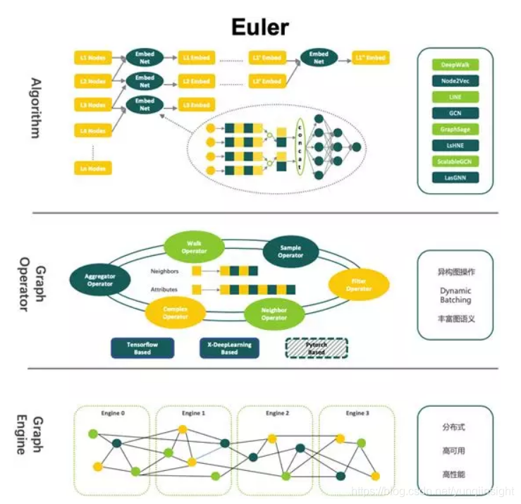 Euler系统整体可以分为三层:最底层的分布式图引擎,中间层图语义的算子,高层的图表示学习算法。