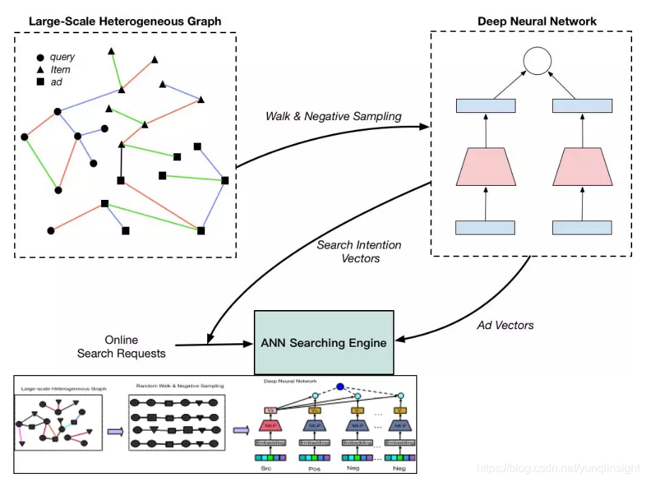 我们首先使用一些传统的挖掘算法,从用户行为日志、内容属性等维度挖掘出Query(查询词), Item(商品)和Ad(广告)的多种关系,然后利用Euler平台的LsHNE方法学习图中节点的embedding,这里节点embedding后的空间距离刻画了原来图中的关系,对于在线过来的请求通过计算用户查询词向量、前置行为中节点向量和广告节点向量之间的距离进行高效的向量化最近邻检索,可以快速匹配到符合用户意图的广告。图2展示了LsHNE方法的离线和在线流程。具体图3展示了样本构造和网络结构示意。