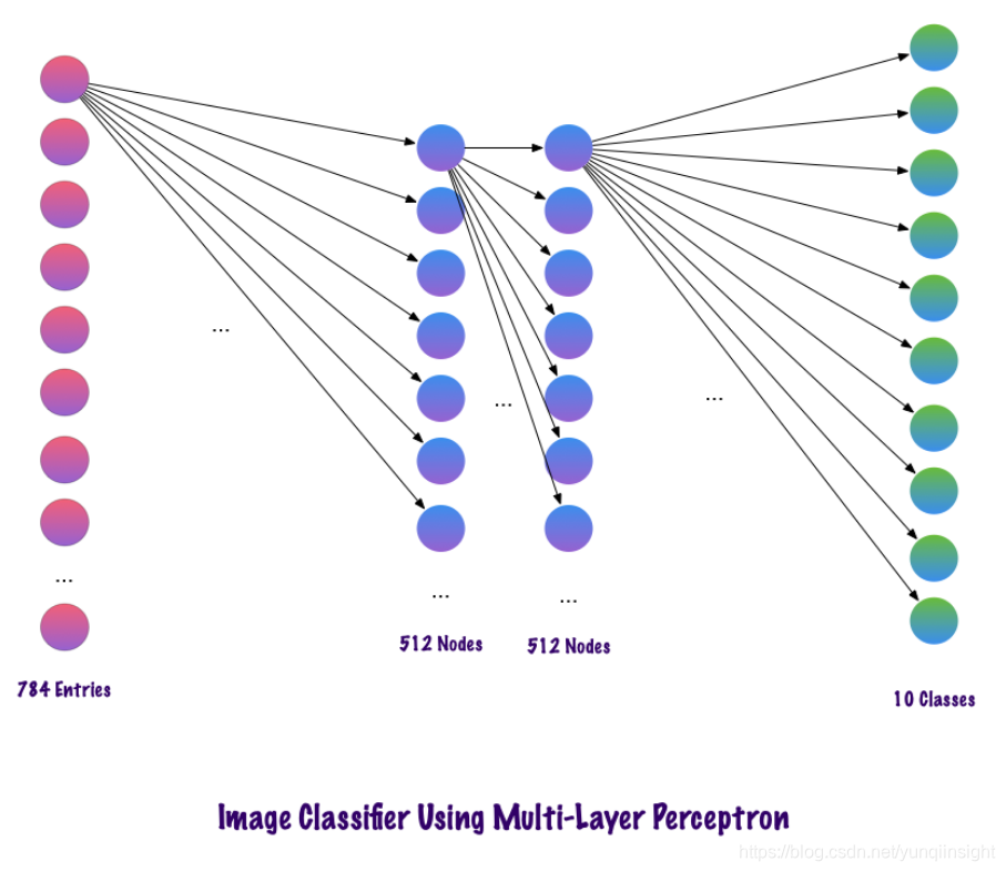 因为输入图像的大小为28x28=784(MNIST数据集),MLP的输入层神经元总数将为784。网络预测给定输入图像中的数字,输出数字范围是0-9。在输出层,一般返回的是类别分数,比如说给定输入是数字“3”的图像,那么在输出层中,相应的神经元“3”与其它神经元相比具有更高的类别分数。这里又会出现一个问题,模型需要包含多少个隐藏层,每层应该包含多少神经元?这些都是需要人为设置的,下面是一个构建MLP模型的例子: