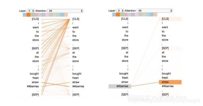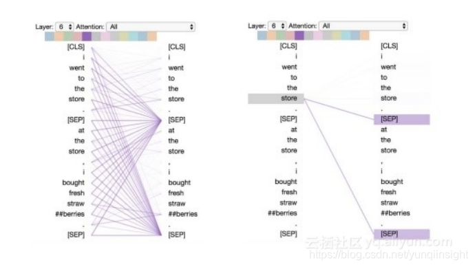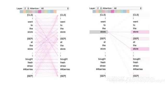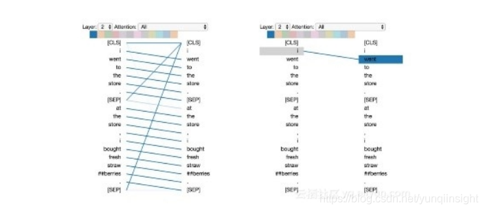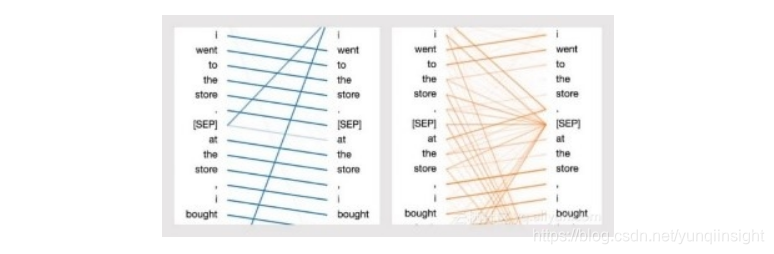 在该模式中,注意力集中在其它句子中与指定单词相同或者相似的单词。如下图,第二个句子中的“store”与第一个句子中的“store”关联最强。这对于下一个句子预测任务非常有帮助,它能够帮助识别句子之间的关系。