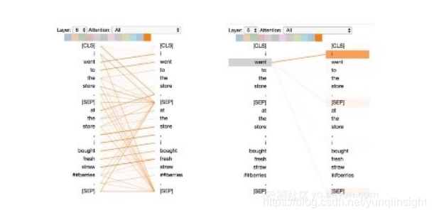 左图中,[SEP]指向了[CLS],而非“at”,也就是说,指向下一个单词的这种模式只在句子中起作用,而在句子间的效果较弱。该模式类似于RNN中的backward,状态从右往左依次更新。
