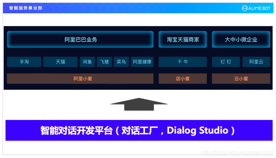 所有的这些场景落地到我们小蜜家族的时候,是通过刚刚介绍过的三大小蜜来承载:阿里小蜜、店小蜜和云小蜜。我们不可能给每一个行业里面的每一个场景去定制一个对话流程,所以我们就沿用了阿里巴巴一贯做平台的思路,这也是我们整个智能对话开发平台的由来。这款产品在内部的名字叫对话工厂(Dialog Studio)。