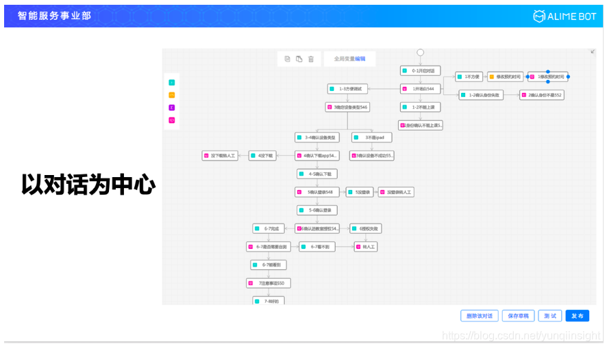 我们在这次对话工厂的设计中彻底把它扭转回来,对话就是要以对话为中心,你在我们的产品界面里面看到的不再是一个个孤立的意图,而是关联在一起的、有业务逻辑关系的对话流程。以意图为中心的设计中,你看到的其实是一个局部视角,就只能实现一些简单的任务,比如控制一个灯,讲个笑话,或者查个天气,如果你想实现一个复杂的任务,比如开一个发票,或者去 10086 里开通一个套餐,它其实是较难实现,很难维护的。我们把整个理念转换一下,回到以对话为中心以后,就会看到全局视野,可以去做复杂的任务,可以去做无限的场景。