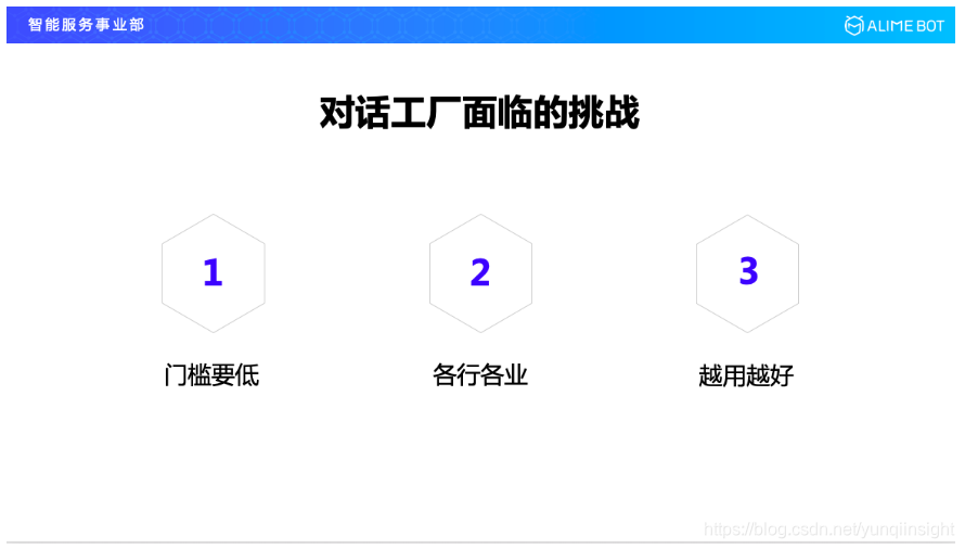整个对话工厂刚刚也说过了,它是一个平台,要做一个平台就会遇到很多挑战:第一个挑战就是对用户来说,希望使用门槛越低越好;第二个挑战是要面对各行各业的各种场景,就要求能做到灵活定制;第三个挑战是上线以后所有的用户肯定都希望你的机器人,你的对话系统能够越用越好,而不是停留在某一个水平就不动了。这就是我们平台所面临的三大挑战。