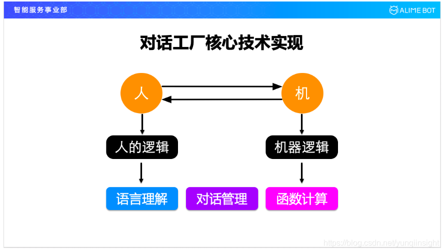 对话工厂首先是用来做对话的,人机对话有两个主体,一个是人,一个是机器,人有人的逻辑,人的逻辑使用什么来表达呢?到今天为止主要还是通过语言,所以我们需要有一个语言理解的服务来承载这一块;机器有机器的逻辑,机器的逻辑到今天为止还是通过代码来表达的,所以我们需要一个函数计算的服务;在人和机器对话的过程中,这种对话过程需要有效的管理,所以我们需要一个对话管理模块。整个对话工厂最核心的三个模块就是语言理解、对话管理和函数计算。