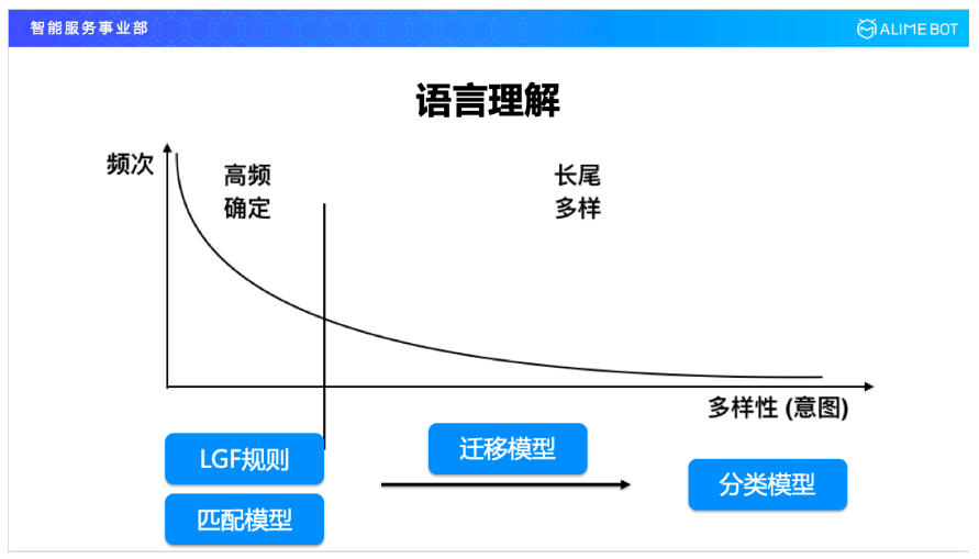 我们先看一下这个图,在整个这个图里面,横轴是意图的多样性,纵轴是频次,这样说有点抽象,我举一个具体的例子,比如说我要开发票,这是一个意图,如果去采样十万条这个意图的用户说法作为样本,把这些说法做一个频率统计,可能排在第一位的就是三个字“开发票”,它可能出现了两万次,另外排在第二位可能是“开张发票”,它可能出现了八千次,这些都是一些高频的说法,还有一些说法说的很长,比如“昨天我在你们商铺买了一条红色的裙子,你帮我开个发票呗”,这种带着前因后果的句式,在整个说法里面是比较长尾的,可能只出现了一次或两次。