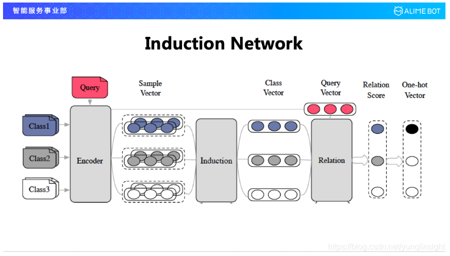 第一层负责将每一个类的每一个样本进行编码,编码成一个向量;第二层是最核心的一层,也就是归纳层,这里面利用胶囊网络的一些方法,把同一个类的多个向量归纳成一个向量;然后第三层 Relation 层把用户新来的一句话和每一个类的归纳向量进行关系计算,输出他们的相似性打分。如果我们想要一个分类结果就输出一个 One-hot,如果不想要 One-hot,就输出一个关系的 Relation score,这是整个 Induction network 的网络结构。