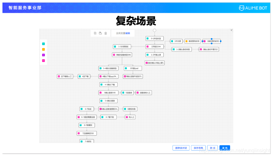 我们再看一个复杂的场景,这是在线教育里面的一个外呼场景,家里有小孩的可能知道,这种在线教育特别火,在上课之前半小时,机器人就会主动给用户打电话,指导软件下载,指导怎么登陆,登陆进去以后怎么进入教室,所有的这些流程都可以通过机器人进行引导。