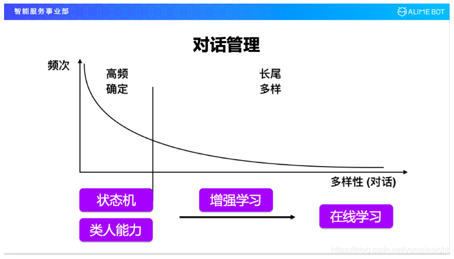 讲了抽象以后,再看一下具体的对话管理技术。从实现上来说,这张图和大家刚才看到的语言理解那张是一模一样的,因为很多东西的分布其实是遵循着共同规律的,区别在与把意图换成了对话。