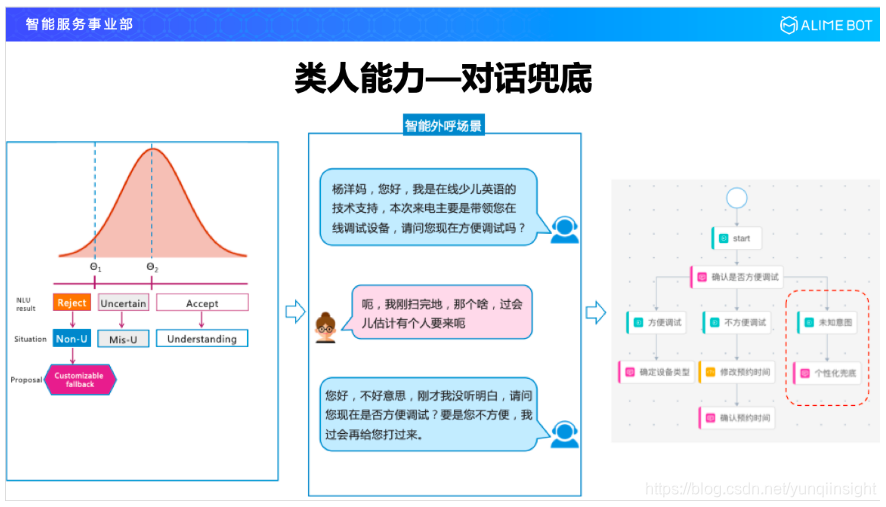 对于拒识这块,比如还是在线英语的这个例子,机器人打来一个电话,问现在方不方便调试设备,这个时候从设计的角度来说希望用户回答方便或者不方便就OK了,但是一旦这个用户回答了一个比较个性化的话,比如,“呃,我刚扫完地,过会儿可能有人要来”,这时候我们的语言理解模块很难捕捉到这是什么语义,这时候需要引入一个个性化的拒识,比如说,“您好,不好意思,刚才没听明白,请问您现在是否方便调试,如果您不方便,我过会儿再给您打过来”,这个就是对话的兜底,是对 unknown 的处理。