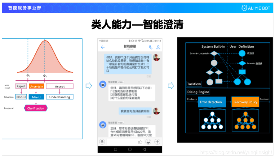 第二个我们看一下澄清,用户说的一句话里面,如果是模糊不清的怎么办?我们通过大量的数据分析发现这种模糊不清主要出现在两种情况下,一种是用户把多个意图杂糅在一段话里来表达;第二种是用户在表达一个意图之前做了很长的铺垫,对于这两种长句子现在的语言理解给出的是意图的概率分布,我们把这个概率分布放到对话管理模块以后就需要让用户进行一轮澄清。比如这个例子,这是移动领域的一个例子,这句话理解有三种意图,到底是想问花费明细,还是套餐的事情还是想问合约的低保,把这三个问题抛给用户进行澄清就可以了。